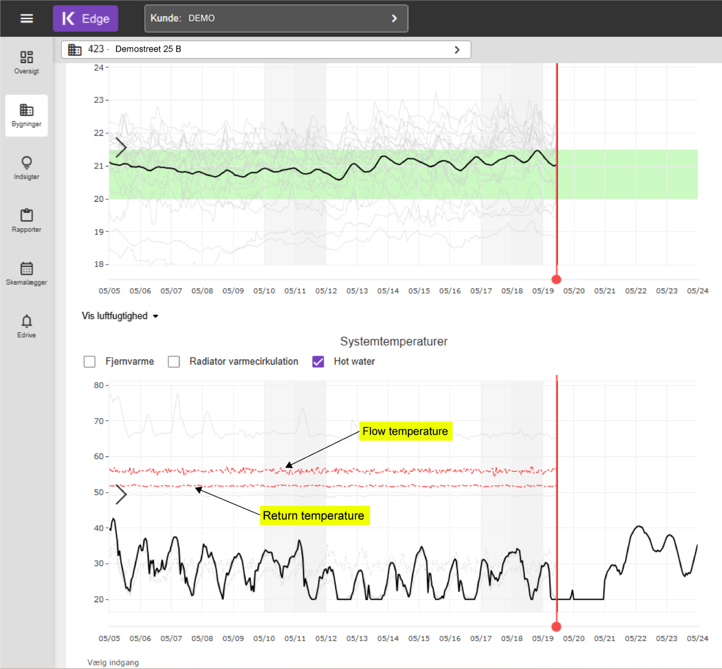 Ved at sikre temperaturer over 50?°C ved tapstederne og op mod 60–66?°C i systemet, kan legionellabakterier effektivt uskadeliggøres – og med Edge ved du præcist, om det sker